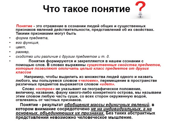 Понятие - результат обобщения массы единичных явлений, в котором внимание сосредоточено не на индивидуальных, а на основных, объединяющих их признаках. Без таких абстрактных представлений невозможно человеческое мышление.