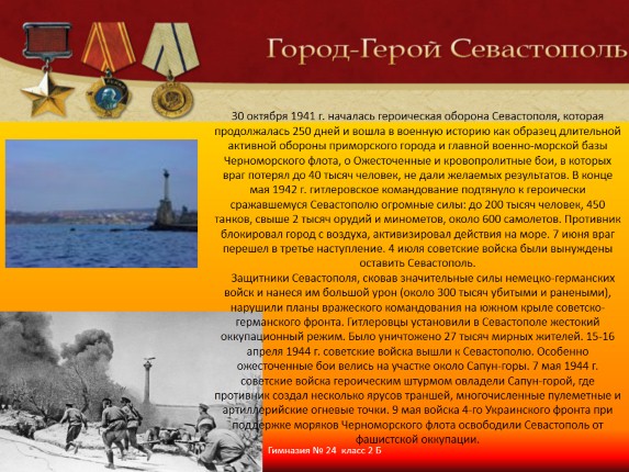 30 октября 1941 г. началась героическая оборона Севастополя, которая продолжалась 250 дней и вошла в военную историю как образец длительной активной обороны приморского города и главной военно-морской базы Черноморского флота, о Ожесточенные и кровопролитные бои, в которых враг потерял до 40 тысяч человек, не дали желаемых результатов. В конце мая 1942 г. гитлеровское командование подтянуло к героически сражавшемуся Севастополю огромные силы: до 200 тысяч человек, 450 танков, свыше 2 тысяч орудий и минометов, около 600 самолетов. Противник блокировал город с воздуха, активизировал действия на море. 7 июня враг перешел в третье наступление. 4 июля советские войска были вынуждены оставить Севастополь. Защитники Севастополя, сковав значительные силы немецко-германских войск и нанеся им большой урон (около 300 тысяч убитыми и ранеными), нарушили планы вражеского командования на южном крыле советско-германского фронта. Гитлеровцы установили в Севастополе жестокий оккупационный режим. Было уничтожено 27 тысяч мирных жителей. 15-16 апреля 1944 г. советские войска вышли к Севастополю. Особенно ожесточенные бои велись на участке около Сапун-горы. 7 мая 1944 г. советские войска героическим штурмом овладели Сапун-горой, где противник создал несколько ярусов траншей, многочисленные пулеметные и артиллерийские огневые точки. 9 мая войска 4-го Украинского фронта при поддержке моряков Черноморского флота освободили Севастополь от фашистской оккупации.