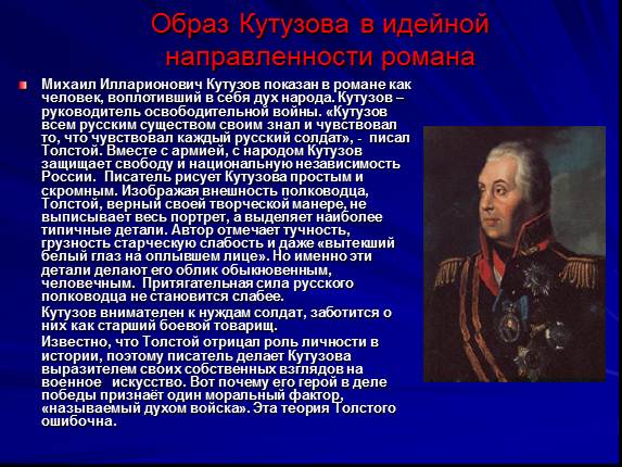 Михаил Илларионович Кутузов показан в романе как человек, воплотивший в себя дух народа. Кутузов – руководитель освободительной войны. «Кутузов всем русским существом своим знал и чувствовал то, что чувствовал каждый русский солдат», - писал Толстой. Вместе с армией, с народом Кутузов защищает свободу и национальную независимость России. Писатель рисует Кутузова простым и скромным. Изображая внешность полководца, Толстой, верный своей творческой манере, не выписывает весь портрет, а выделяет наиболее типичные детали. Автор отмечает тучность, грузность старческую слабость и даже «вытекший белый глаз на оплывшем лице». Но именно эти детали делают его облик обыкновенным, человечным. Притягательная сила русского полководца не становится слабее.