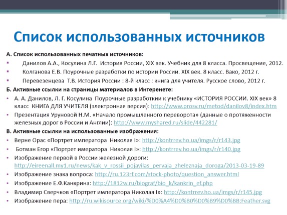 Презентация Уруновой Н.М. «Начало промышленного переворота» (данные о протяженности железных дорог в России и Англии): http://www.myshared.ru/slide/442281/