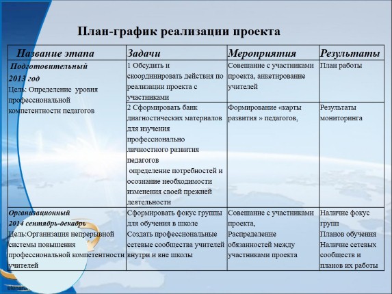Цель: Определение уровня профессиональной компетентности педагогов 1 Обсудить и скоординировать действия по реализации проекта с участниками Совещание с участниками