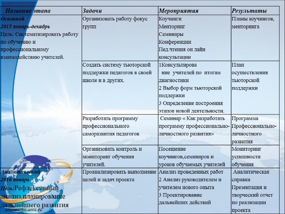 Цель: Систематизировать работу по обучению и профессиональному взаимодействию учителей. Организовать контроль и мониторинг обучения учителей. Посещение коучингов,семинаров и уроков обучаемых учителей Мониторинг успешности обучения