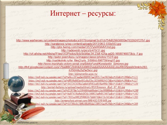 Интернет – ресурсы: http://www.warheroes.ru/content/images/photodocs/9178/original/3cd7cb754d829938850e7832924727b1.jpg http://saralpova.ru/wp-content/uploads/2013/06/2-830x553.jpg http://pbs.twimg.com/media/CEZZylxW0AAVUnd.jpg http://radiovesti.ru/pics/b/479/31.jpg http://s4.afisha.net/Afisha7Files/UGPhotos/9cb/9cb6ec34-23df-425a-ad20-165f8748873b/p_F.jpg http://avtor.poem4you.ru/images/classic/photos/152/8.jpg http://rushkolnik.ru/tw_files2/urls_3/899/d-898739/img15.jpg http://www.marshals-victory.senat.org/BiblioFund/Konstantin_Simonov.jpg http://lh4.googleusercontent.com/-PxeW9CZb9Vk/Un4WVZvsduI/AAAAAAAALmw/RhS5pxeM3mk/w283-h350/n9y2sDeDxcc.jpg http://elenaranko.ucoz.ru/ https://im0-tub-ru.yandex.net/i?id=e0cc287ea0eb90f467ae5f4517ce502b&n=33&h=190&w=121 https://im3-tub-ru.yandex.net/i?id=ff959d665e491c8cf1bc185b0983457f&n=33&h=190&w=127 https://im1-tub-ru.yandex.net/i?id=342242438a2afab5f502cd058a496c7f&n=33&h=190&w=134 http://portal-kultura.ru/upload/medialibrary/053/Simonov_Kult_07_03.jpg https://im2-tub-ru.yandex.net/i?id=f22970e7c3594604dd0bde413e599f00&n=33&h=190&w=280 https://im3-tub-ru.yandex.net/i?id=bd87419a9eb3f26c160925efb052467a&n=33&h=190&w=162 https://im2-tub-ru.yandex.net/i?id=7935a3982f59063b7bfd676feb73c562&n=33&h=190&w=285 http://screenshots.etvnet.com/000/432/550/b08.jpg https://im1-tub-ru.yandex.net/i?id=337fbb3c18f6c88d93de128924acf429&n=33&h=190&w=289