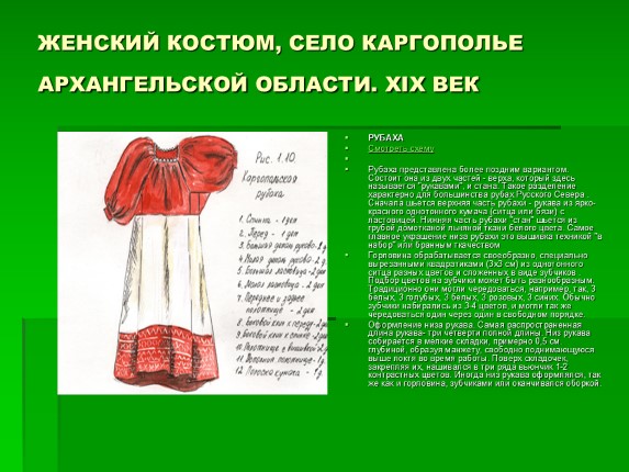Рубаха представлена более поздним вариантом. Состоит она из двух частей - верха, который здесь называется "рукавами", и стана. Такое разделение характерно для большинства рубах Русского Севера . Сначала шьется верхняя часть рубахи - рукава из ярко- красного однотонного кумача (ситца или бязи) с ластовицей. Нижняя часть рубахи "стан" шьется из грубой домотканой льняной ткани белого цвета. Самое главное украшение низа рубахи это вышивка техникой "в набор" или бранным ткачеством