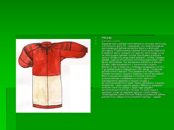 Верхняя часть рубахи изготовлена из четырех полотнищ отбеленного льна. По - видимому, это поздний вариант кроя девичьей рубахи (ее могла носить и молодая женщина). Первоначально рубаха была цельнокроеной. В верхней части переднего и заднего полотнища, а так же небольшие прямые полики присобраны в мелкие густые сборки под невысокий вороник - стойку. Прямые рукава, сшитые из цельных полотнищ кумачовой ткани, внизу присобраны под неширокие манжеты в мелкие сборки, зафиксированные с изнаночной стороны. Манжеты застегивались с помощью воздушных петель. Под рукава вшиты квадратные ластовицы. Рязанская рубаха очень нарядна. Она украшена по воротнику, линиям поликов и грудного разреза счетной вышивкой. Места соединения рукавов и поликов отмечены декоративными нашивками из полос красного коклюшечного кружева и черной тесьмы с металлическими блестками. Яркие кумачовые нашивки обрамляют также грудной разрез. Манжеты украшают полоски золотого шнура с нашитыми рядами металлических блесток и бисера. По низу подола проходит нашитая широкая красная тканая кайма с тремя рядами узких полосок. Кайма на девичьей рубахе должна быть видна из-под верхней одежды - шушки.