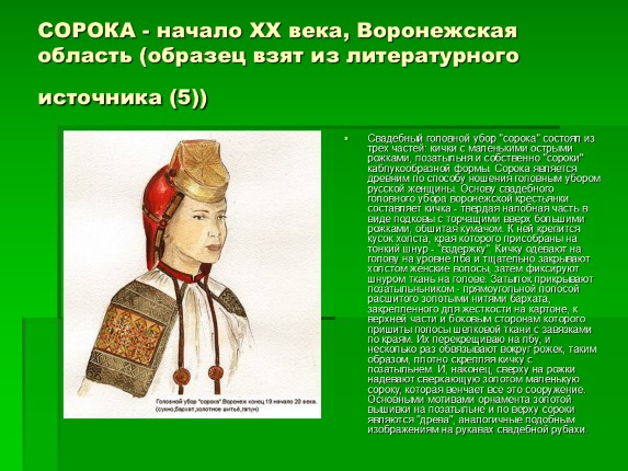 Свадебный головной убор "сорока" состоял из трех частей: кички с маленькими острыми рожками, позатыльня и собственно "сороки" каблукообразной формы. Сорока является древним по способу ношения головным убором русской женщины. Основу свадебного головного убора воронежской крестьянки составляет кичка - твердая налобная часть в виде подковы с торчащими вверх большими рожками, обшитая кумачом. К ней крепится кусок холста, края которого присобраны на тонкий шнур - "вздержку". Кичку одевают на голову на уровне лба и тщательно закрывают холстом женские волосы, затем фиксируют шнуром ткань на голове. Затылок прикрывают позатыльньником - прямоугольной полосой расшитого золотыми нитями бархата, закрепленного для жесткости на картоне, к верхней части и боковым сторонам которого пришиты полосы шелковой ткани с завязками по краям. Их перекрещиваю на лбу, и несколько раз обвязывают вокруг рожек, таким образом, плотно скрепляя кичку с позатыльнем. И, наконец, сверху на рожки надевают сверкающую золотом маленькую сороку, которая венчает все это сооружение. Основными мотивами орнамента золотой вышивки на позатыльне и по верху сороки являются "древа", аналогичные подобным изображениям на рукавах свадебной рубахи.