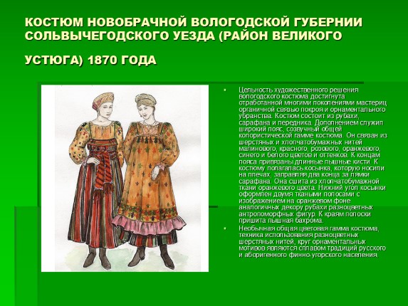 Цельность художественного решения вологодского костюма достигнутa отработанной многими поколениями мастериц органичной связью покроя и орнаментального убранства. Костюм состоит из рубахи, сарафана и передника. Дополнением служил широкий пояс, созвучный общей колористической гамме костюма. Он связан из шерстяных и хлопчатобумажных нитей малинового, красного, розового, оранжевого, синего и белого цветов и оттенков. К концам пояса привязаны длинные пышные кисти. К костюму полагалась косынка, которую носили на плечах, заправляя два конца за лямки сарафана. Она сшита из хлопчатобумажной ткани оранжевого цвета. Нижний угол косынки оформлен двумя ткаными полосами с изображением на оранжевом фоне аналогичных декору рубахи разноцветных антропоморфных фигур. К краям полоски пришита пышная бахрома.