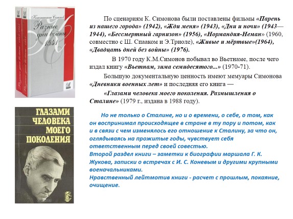 Большую документальную ценность имеют мемуары Симонова «Дневники военных лет» и последняя его книга —