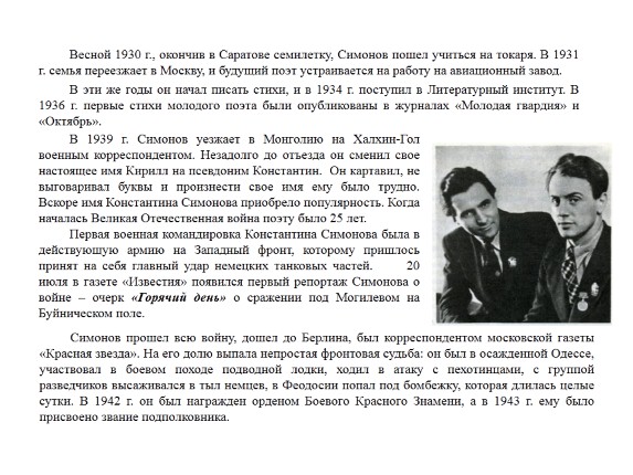 В феврале 1942 года, когда под ударами советских войск гитлеровцы откатились от Москвы, газета «Правда» опубликовала лирическое стихотворение, которое сразу завоевало сердца наших солдат. Это было стихотворение «Жди меня». Солдаты вырезали его из газеты, переписывали, сидя в окопах, заучивали наизусть и посылали в письмах женам и невестам. Его находили в нагрудных карманах раненых и убитых бойцов. В истории русской поэзии трудно найти стихотворение, которое бы имело такое же широкое звучание в народе, как «Жди меня». Оно сделало всемирно известным офицера Советской Армии, русского поэта Константина Симонова.