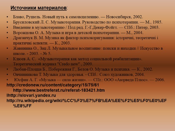 Брусиловский Л. С. Музыкотерапия. Руководство по психотерапии. — М., 1985.