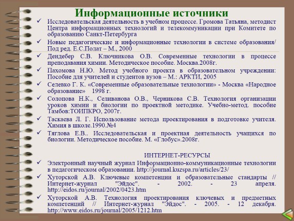 Солопова Н.К., Селиванова О.В., Черникова С.В. Технология организации уроков химии и биологии по проектной методике. Учебно-метод. пособие Тамбов:ТОИПКРО, 2007г.